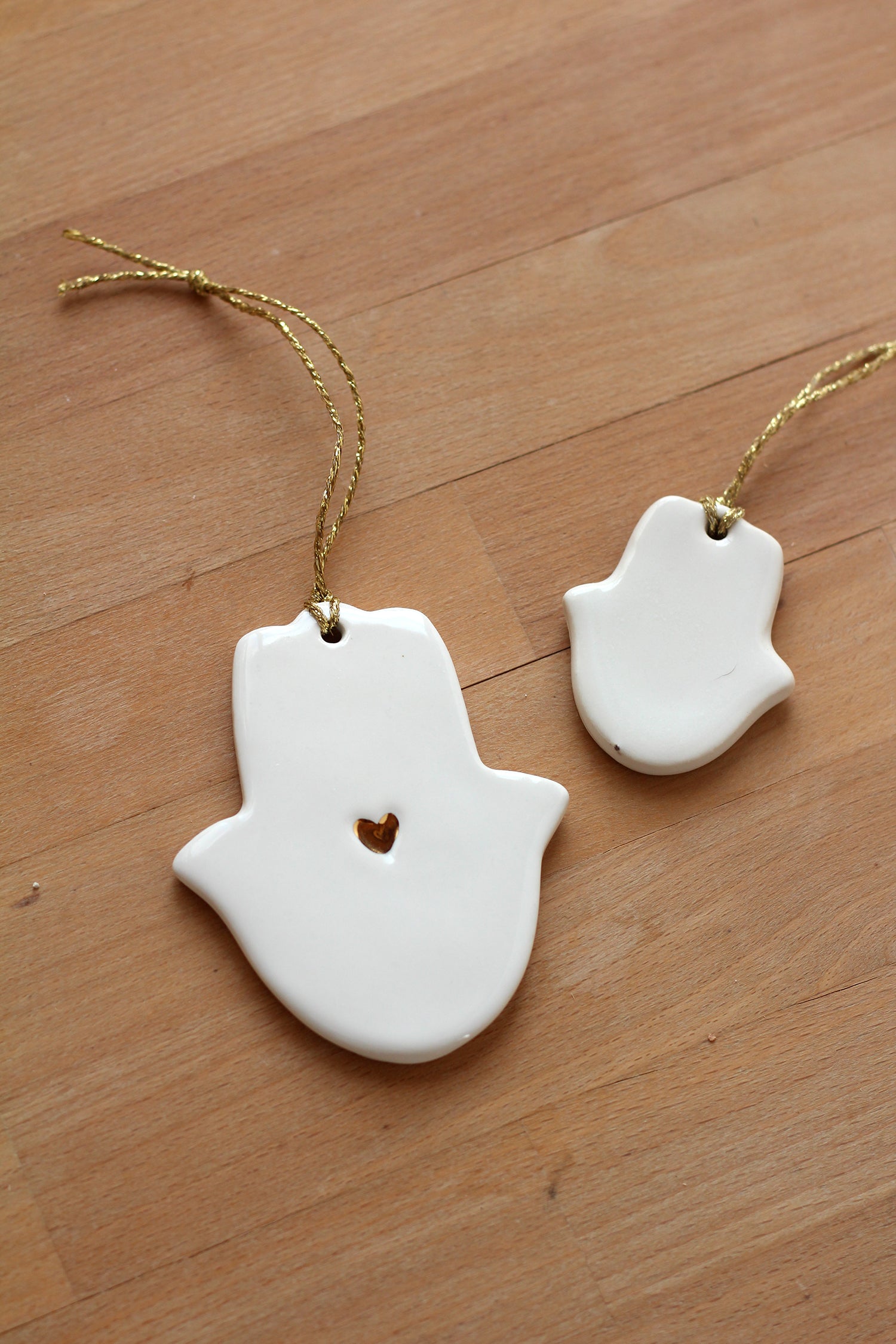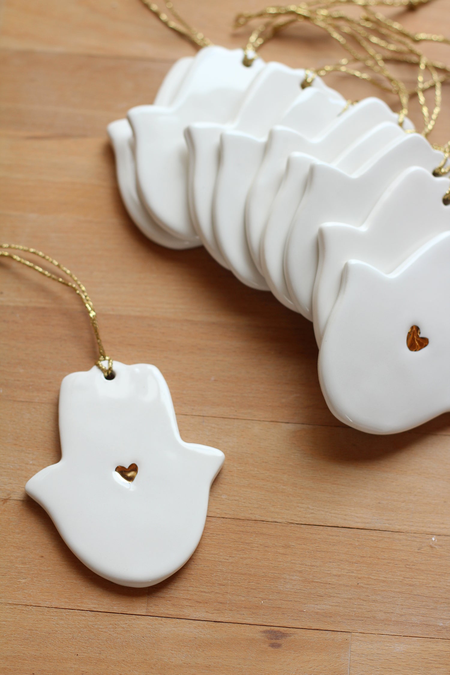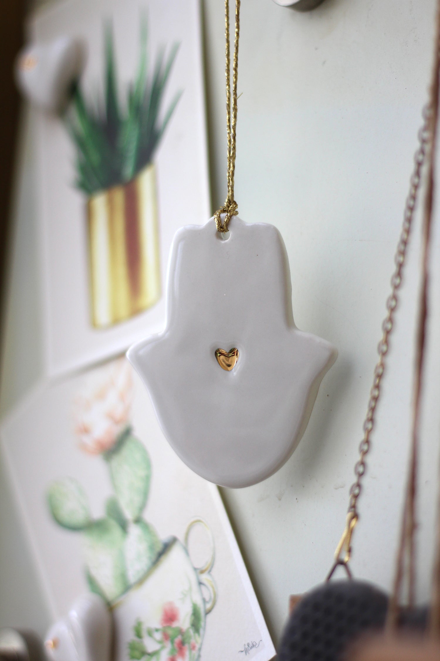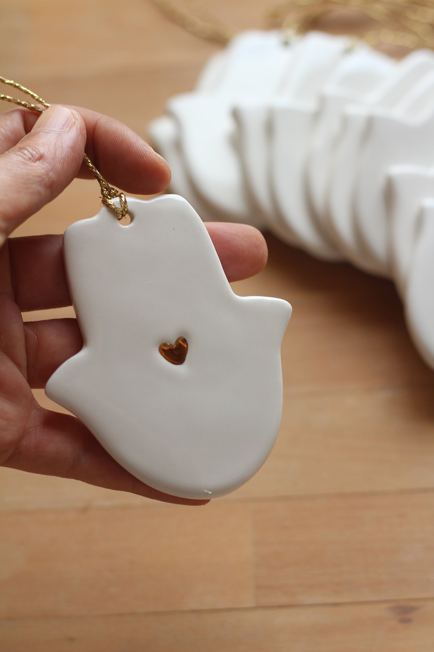 חמסה לבנה בינונית עם הטבעה של לב זהב, מקרמיקה בעבודת יד - סימן של שמירה, ברכה והגנה.