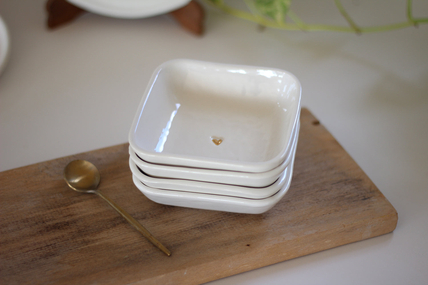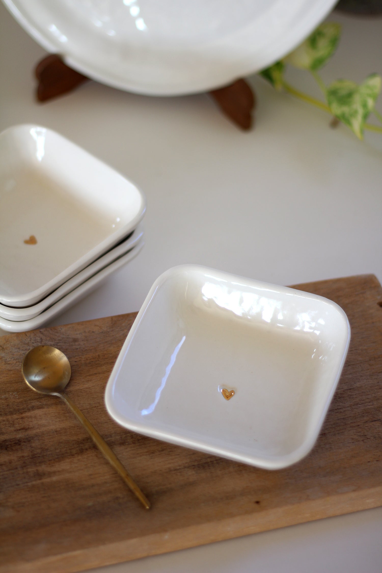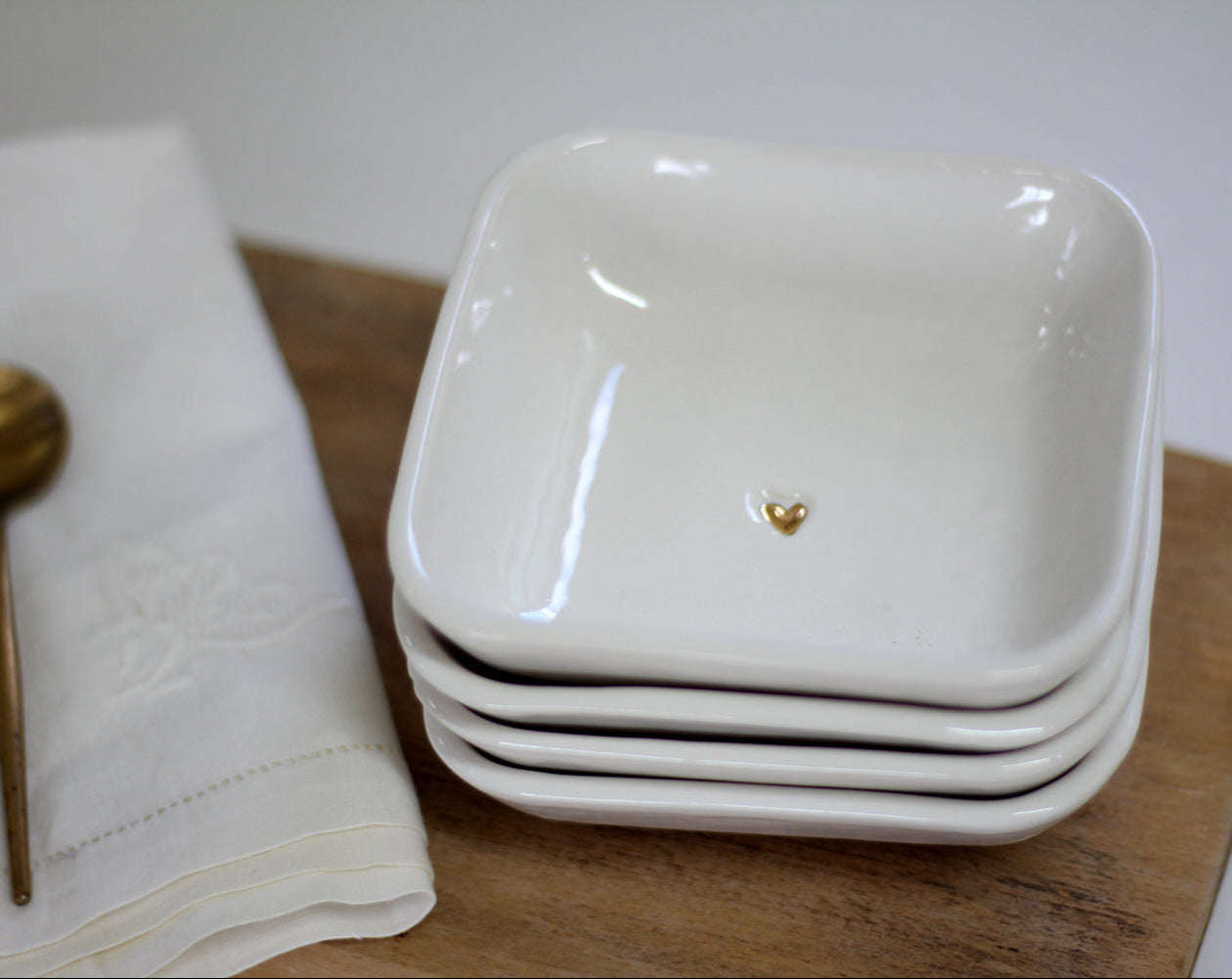 רביעיית קעריות תמרה מרובעות מקרמיקה - בגלזורה לבנה עם נגיעה עדינה של לב זהב במרכז.
